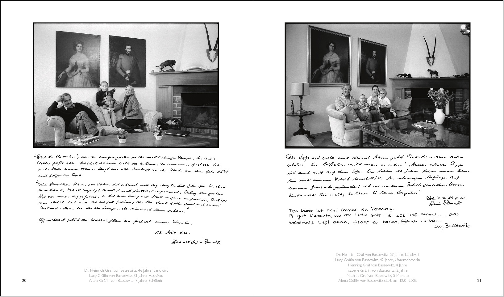 Die sehr privaten Bildunterschriften gestatten dennoch nur einen begrenzten Einblick ins Separee. Vor allem bezeugen sie Dankbarkeit. Eine Dankbarkeit dem Leben und seinen Möglichkeiten gegenüber. Sie ermahnen innezuhalten, Resümee zu ziehen, Stolz auf Erreichtes zuzulassen und auszudrücken. Die Lebensgeschichten dahinter sind vielgestaltig, lebhafter, angesammelt – wie Leben eben ist. Die fotografischen Gegenüberstellungen rücken Vergangenheit und Gegenwart eines Jahrzehnts zusammen und erzählen von Aufarbeitung, Kindererziehung, Tagesgeschäften und Sorgenfalten. Und von der Suche nach dem privaten Glück. Alltag nebenan. Zeitzeugnis, Unterhaltung, gelebte Jahre – authentisch, fühlbar, auch scharf, auch verzagt, humorvoll gewiss. Manchmal gezwungenermaßen. Denn das Leben ist nicht immer rosarot. Und jenes in einem großen, wenn auch Gutshaus, vielleicht seltener als andernorts. Aber mit einem Lächeln wird’s leichter, und mit dem Wissen darum, alles nach Kräften getan zu haben, »zu erwerben, um neu zu besitzen, was du von deinen Vätern ererbt hast«