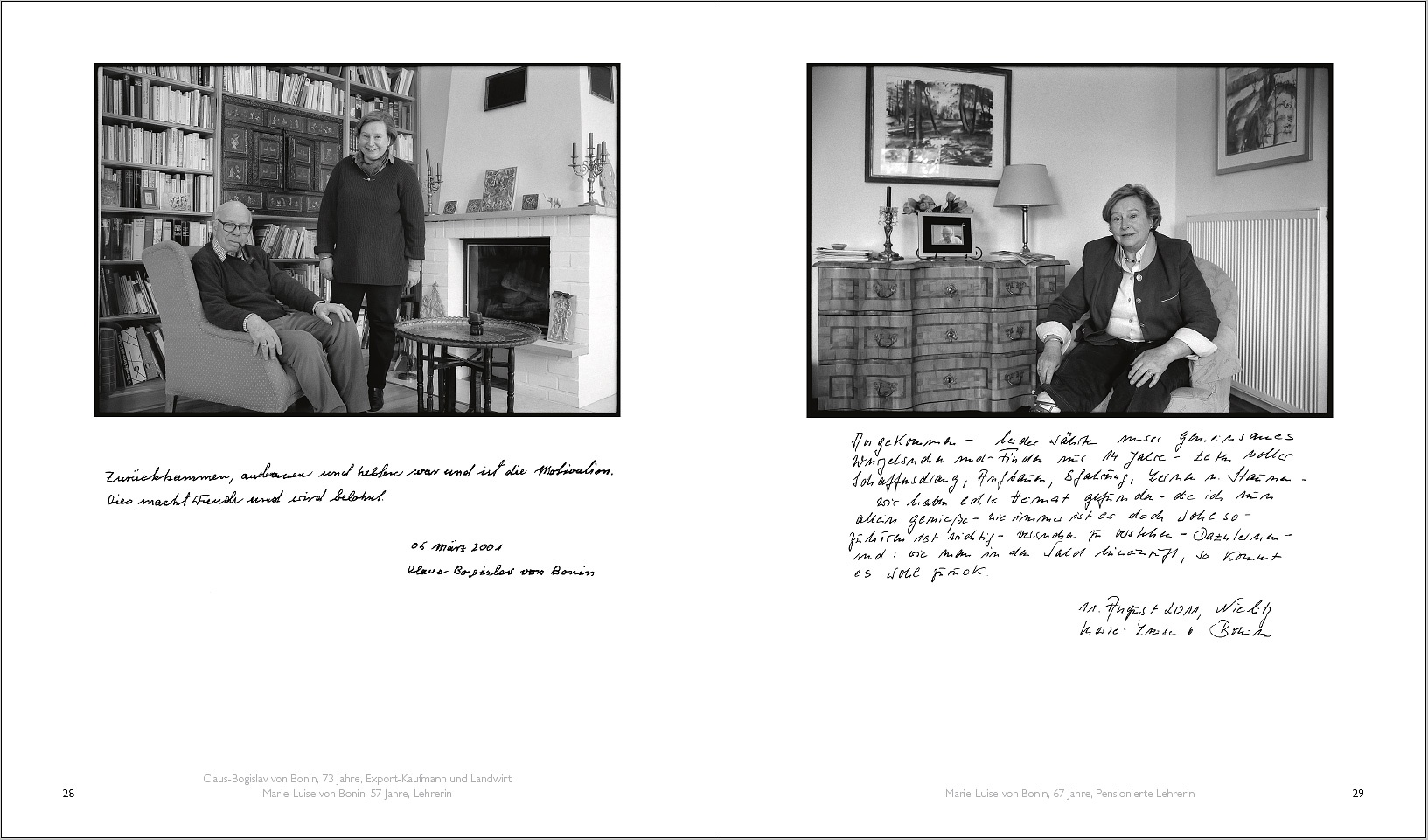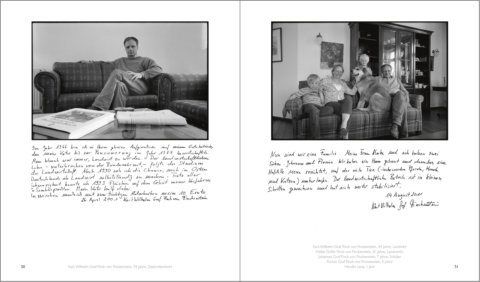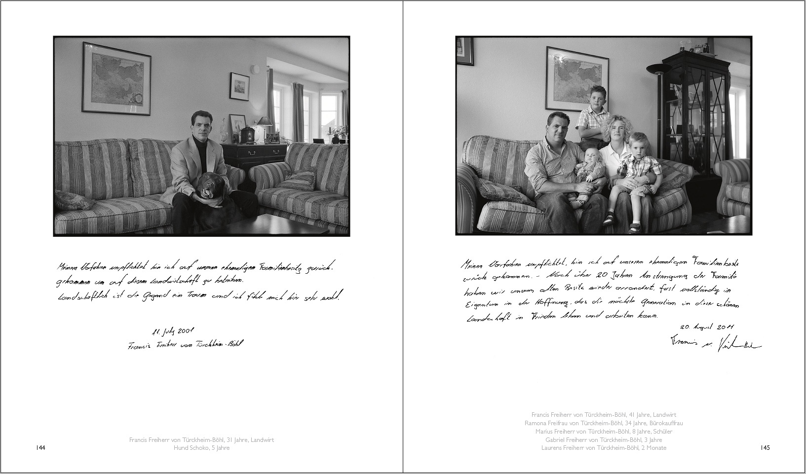 Für den Betrachter und Leser dieser Zeitdokumentation entwickelt sich bereits auf den ersten Buchseiten ein roter Faden, der sich durch 65 Lebensmodelle zieht: Unseren Kindern gehört die Zukunft, dafür leben und ringen wir. Dass sie einen besseren, sicheren Start haben mögen, dass sie der Großeltern Erbe achten, dass sie Tradition freudigen Herzens leben. Auch die Hoffnung bleibt nicht unerwähnt, dass die Nachfahren sich am Ländlichen erwärmen und die Zügel übernehmen. All die Entbehrungen, Schlachten, Enttäuschungen, die kleinen Schritte, die überschaubaren Erfolge werden aus einem Pflichtbewusstsein heraus in Kauf genommen, dessen Ursprung mitnichten in der Blaublütigkeit liegt. »Eine Verantwortung wohl, die mit Familienbindungen zu tun hat, mit sozialem Engagement, mit einem Werteverständnis, das keineswegs nur auf materielle Sicherheit abzielt. Es geht um das Zurruhekommen, um Pflichterfüllung, um Glaube und Tradition und, nicht zuletzt, um Heimkehr.« Dieser Satz aus dem Vorwort des ersten Bildbandes hat in zehn Jahren an Wahrheit und Dringlichkeit dazugewonnen. »Meinen Vorfahren verpflichtet«, beginnt der Bildtext von Francis Freiherr von Türkheim-Böhl, und weiterführend, Gudrun von Holtzendorff: »Möge es die nächste Generation so weitergeben.«