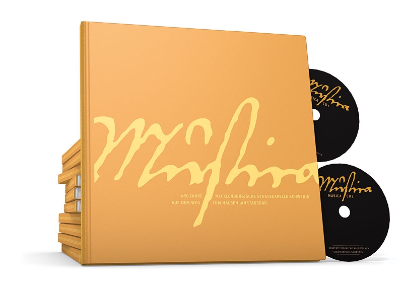 Ein großer Band in festlichem Gewand: 450 Jahre Mecklenburgische Staatskapelle Schwerin – Auf dem Weg zum halben Jahrtausend schimmert und glänzt in goldenem Leinen. Den Titel ziert der geprägte Schriftzug „Musica“ – ein Ausschnitt aus der Gründungsurkunde aus dem Jahr 1563 und gleichzeitig ein Verweis auf die lange und wechselreiche Tradition des Klangkörpers.